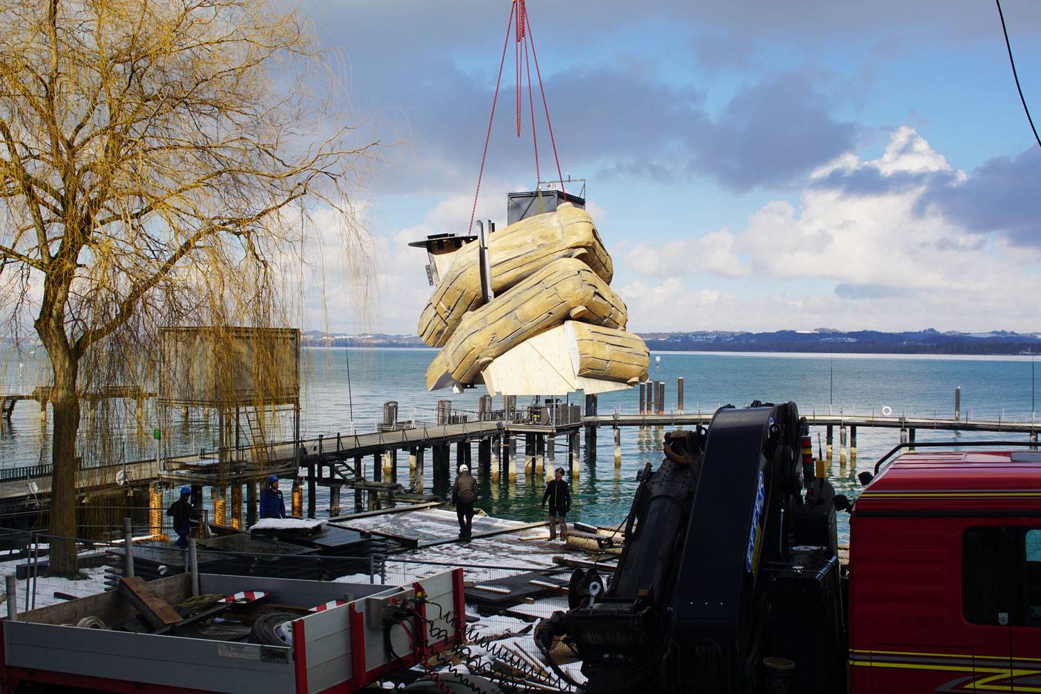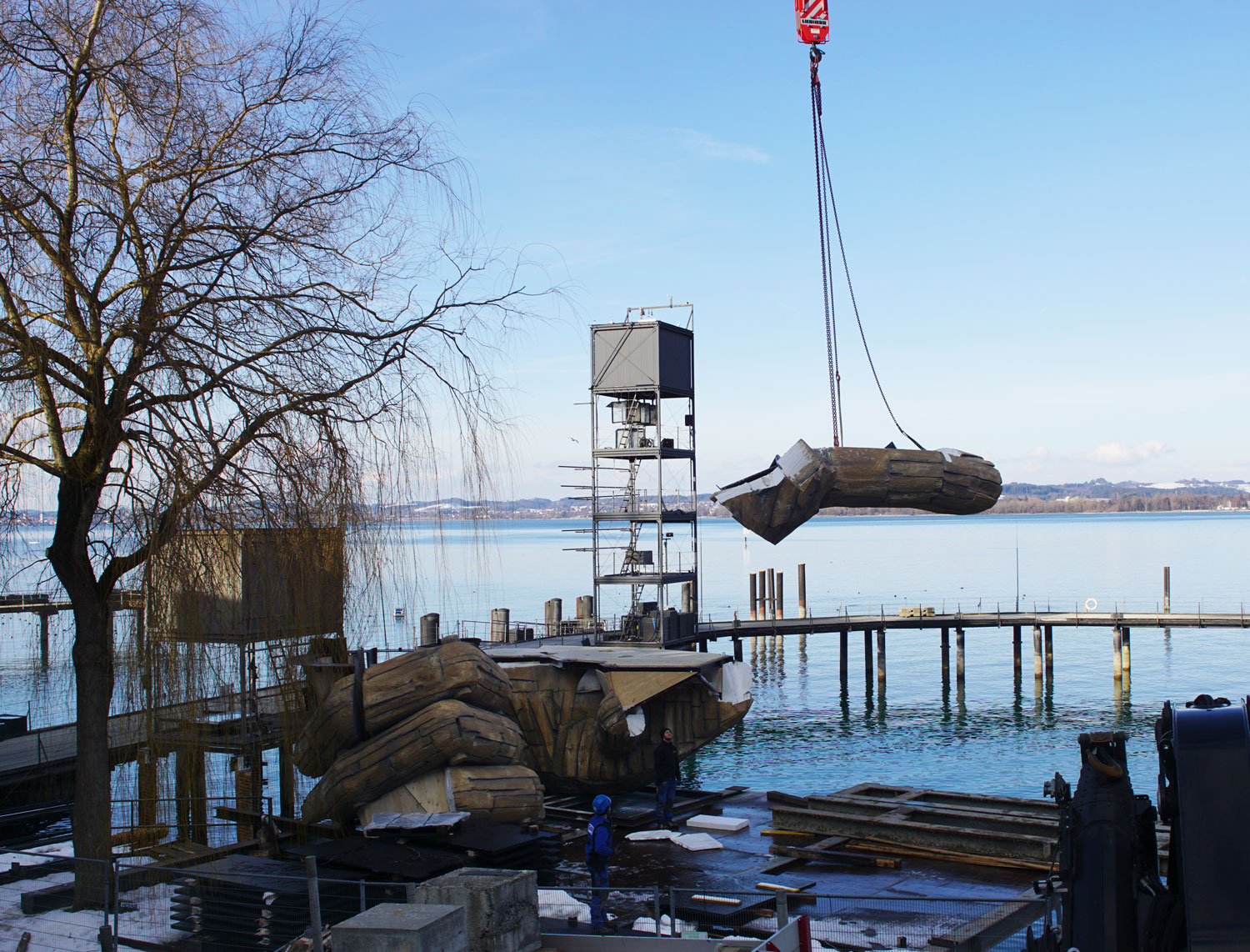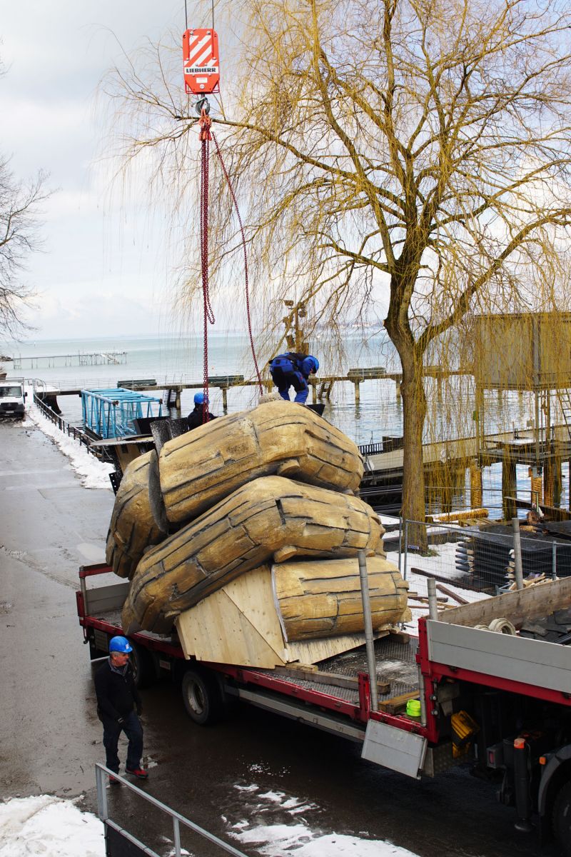 All the stage pieces are made from core constructions of steel and wood. These three colossal body parts are essential elements of the stage, but not the only ones. The Rigoletto set consists of other parts which will be added to the lake stage in the next few weeks. These monumental structures weighing 35 tonnes were delievered to this beautiful destination by truck and then by boat to the lake stage.